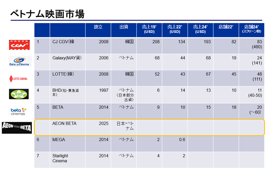 続く4番手がBETA、5番手が日系企業が資本参画するベトナム企業のBHDで、当社イオンエンターテイメントはBETAと合弁を組む形で参入した、という位置づけになります。