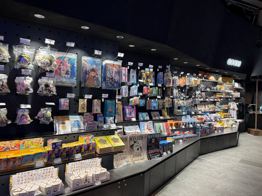 上映作品においては、自社配給事業を行い日本映画およびアニメ作品のラインアップを強化しています。日本が世界に誇る人気タイトルや話題作を積極的に上映するとともに、日本アニメの公式グッズ販売にも注力し、日本のコンテンツを館内全体で楽しんでいただける環境づくりを進めています。(「鬼滅の刃」「進撃の巨人」「SPY×FAIMLY」「NARUTO」など日本のトップ級IPグッズが並んでいる)。