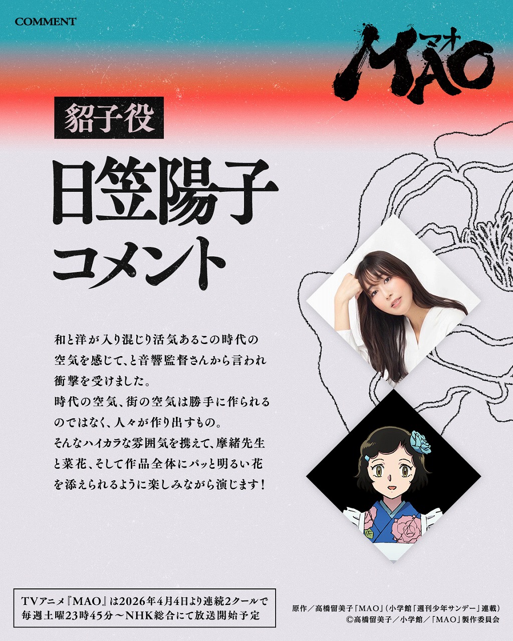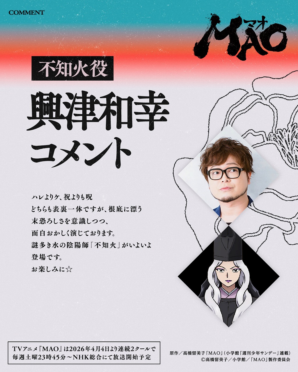 TVアニメ『MAO』が、2026年4月4日より連続2クールで毎週土曜23時45分~放送すると発表。アニメーション制作は高橋留美子原作作品では『犬夜叉』・『犬夜叉 完結編』以来となる、サンライズが手掛ける
