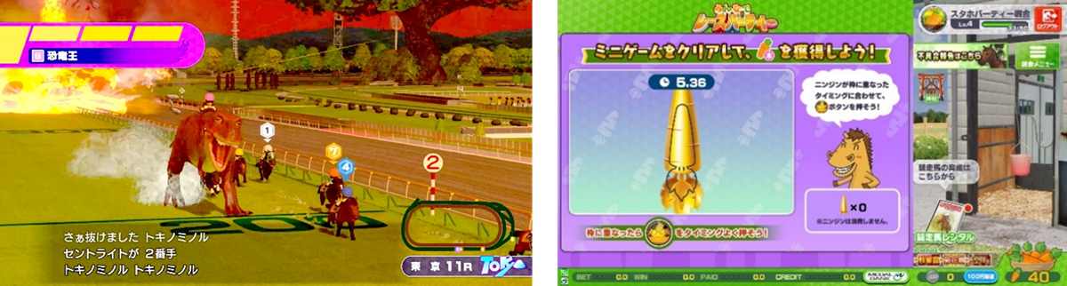 レース中に「ニンジンボタン」をタイミングよく押すミニゲームが発生し、成功度合いに応じてボスにダメージを与えることができ、与えたダメージ量に応じて「ニンジン」を獲得できる。