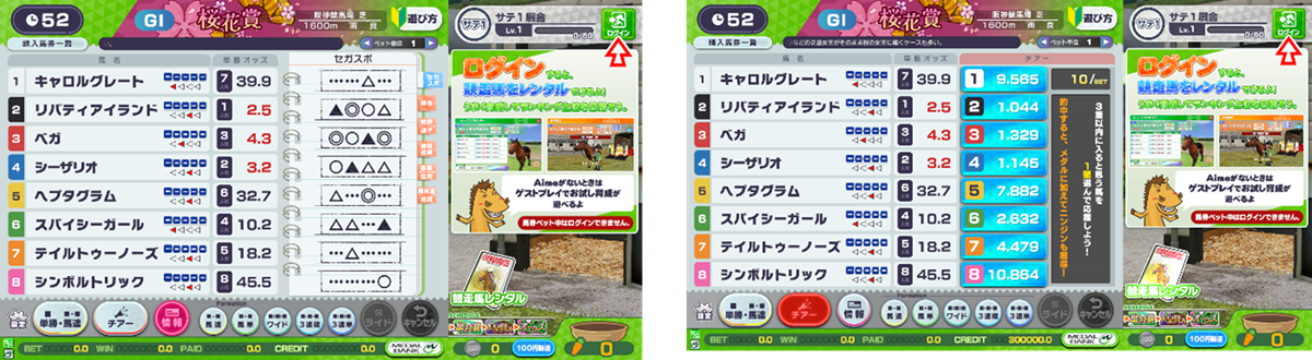 筐体の「ニンジンボタン」をタイミングよく押すことで、自身のレンタル馬に「ニンジン」を届けることができ、レースを有利に進めることができる。