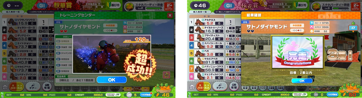 ライフがゼロになる前に完走条件を達成すると、アイテムや新たなレンタル競走馬解放などが獲得できるボーナスゲームに挑戦できる。
