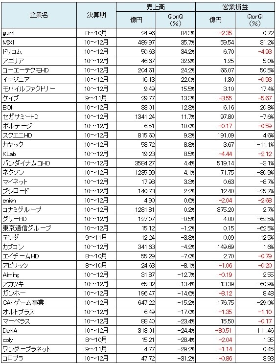 さて、今回も前回までの形と同じく、テーマごとに少し切り分け、この記事では10~12月期の決算シーズンの主要ゲーム関連企業の決算の概略をまとめてみたい。これまでの記事とデータの連続性も踏まえ、エイチーム<3662>とgumi<3903>、アピリッツ<4174>、coly<4175>などの決算は既に次の四半期の決算発表が迫っているが9~10月期の数字を使用している。