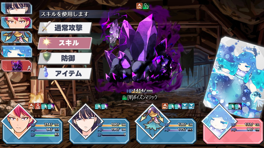 ・シンプルなフロントビュー戦闘に、「ブーストシステム」を搭載。戦闘中の行動によって溜まる「BP」を消費して即座に発動できる強力な奥義「ブースト」が、カットイン演出と共にボス戦を盛り上げる。