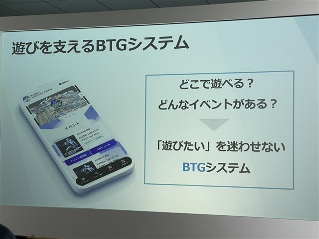 BTGシステムはブラウザからアクセス可能となっており、イベントの検索やエントリー、対戦結果の記録までを完結できる。また、バンダイカードゲーム事業部が展開するプラットフォーム「TCG+」の運用ノウハウを最大限に活用することで、“行けば仲間がいる”、“戦えるワクワクや安心感”をユーザーに提供できるとの話だった。