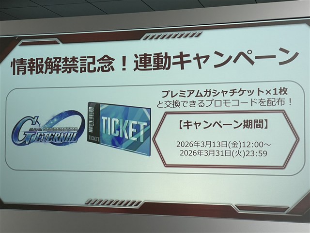 スマートフォンアプリ『SDガンダム ジージェネレーション エターナル』との連動キャンペーンも実施。「GUNDAM ASSEMBLE」の情報解禁を記念して、3月13日12:00~31日23:59までの期間、アプリ内で使用できるプレミアムガシャチケット1枚が手に入るプロモーションコードを配布する。