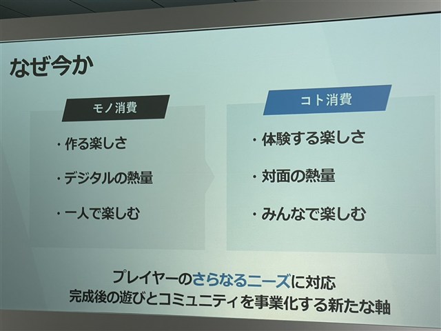 では、なぜ今「BANDAI TABLETOP GAMES」を立ち上げたのか。まず、2020年のコロナ禍には家で過ごす時間が長くなったことにより、巣篭り需要でデジタルゲームやプラモデルの需要が伸びた背景がある。次に、対面でのコミュニケーションが復活してからエンタメ業界で市場拡大したもののひとつがアナログトレーディングカードゲーム市場になる。同社では、この流れはデジタル化が進む中で人と人が向き合って同じテーブルを囲むアナログゲームの価値が改めて見直された結果だと考えている。そこで、プラモデルとアナログゲーム事業を掛け合わせることで今の時代に求められている“ものづくり”と“遊び”を提供できると確信できたことが今回の動きに繋がったと経緯を説明した。