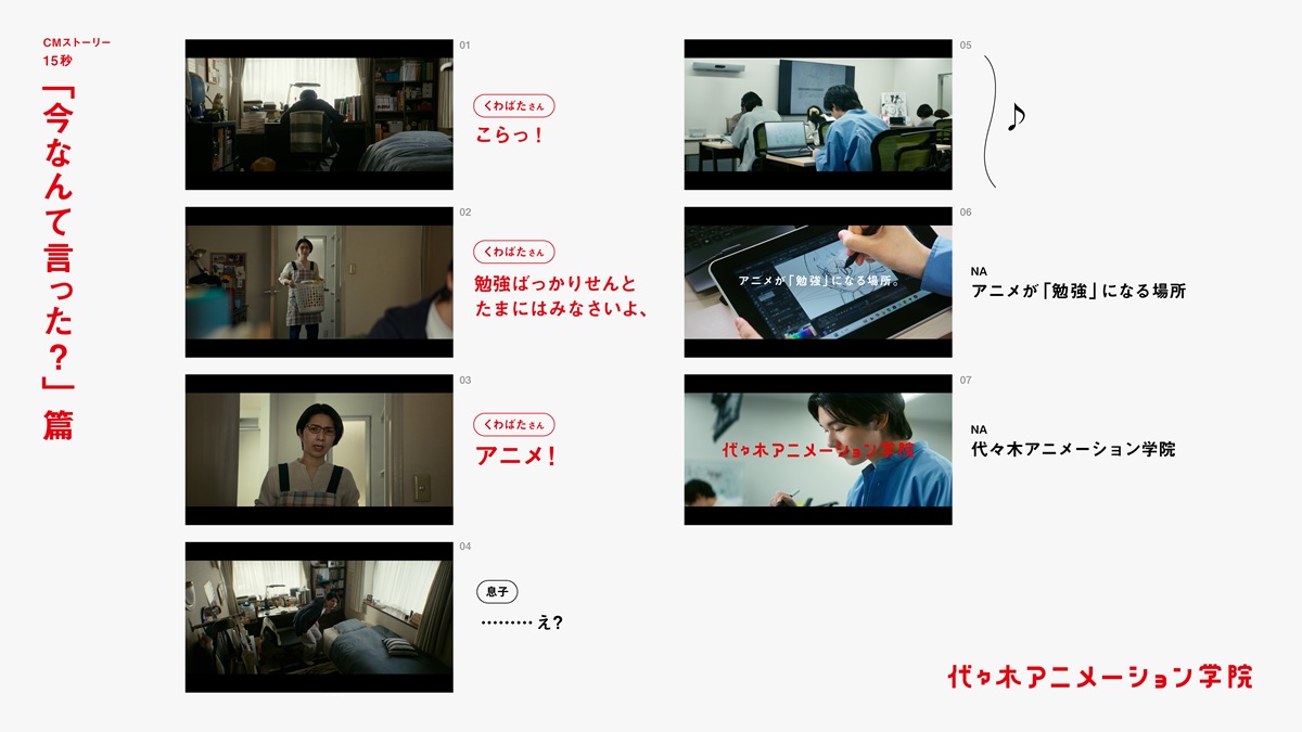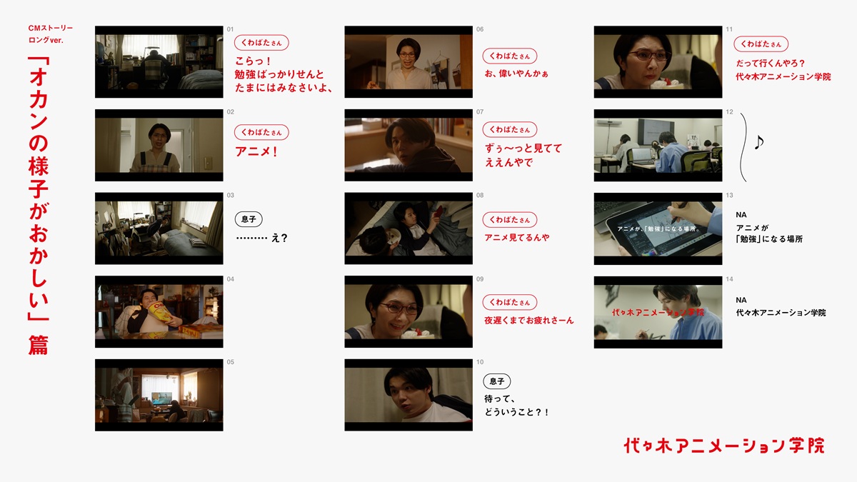 本CMでは、アニメに夢中になる男子高校生と、それをなぜか大絶賛する母親役のくわばたりえさんとのコミカルな掛け合いを通じて、「アニメが「勉強」になる場所」という代々木アニメーション学院の魅力を伝えるCMとなっている。