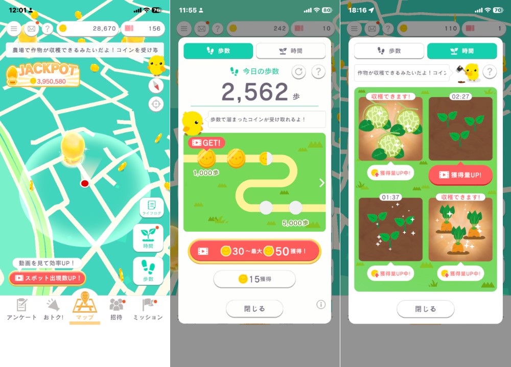 ・歩かなくてもコインを獲得できる「農場」システムも搭載
