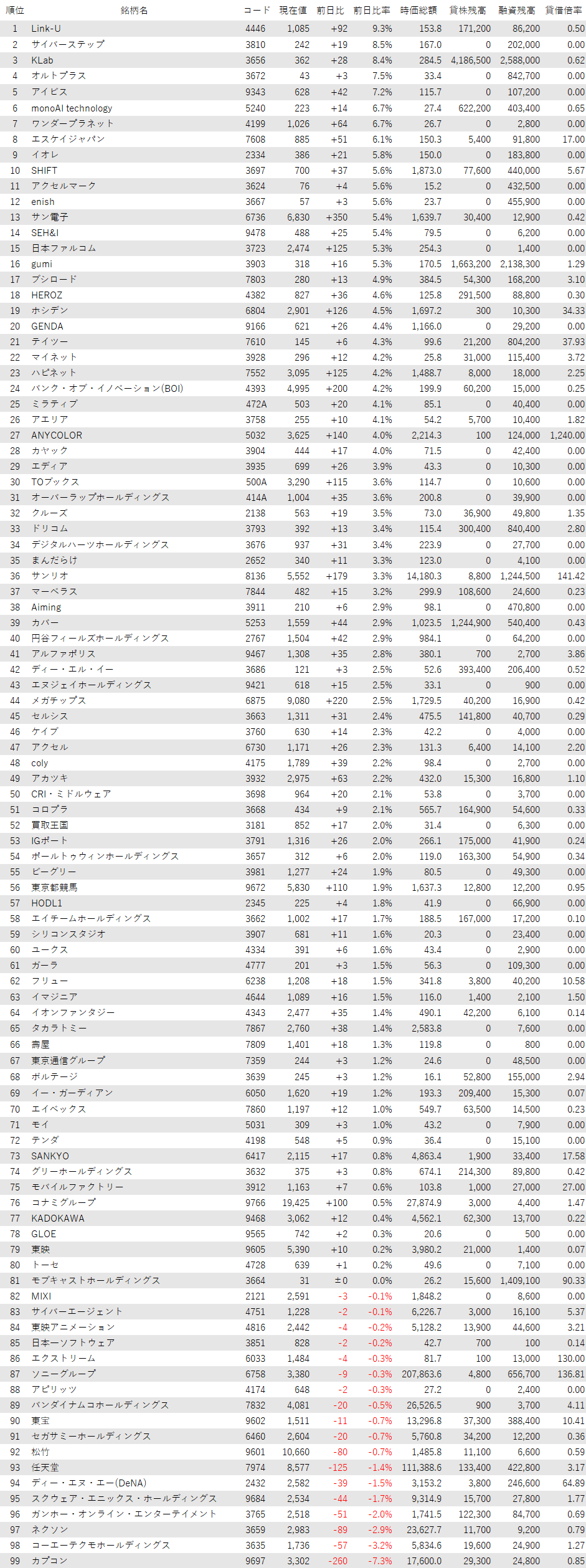 最後に騰落ランキングを見ると、Link-U<4446>やサイバーステップ<3810>、KLab<3656>、オルトプラス<3672>、アイビス<9343>が値上がり率上位となり、カプコン<9697>、コーエーテクモHD<3635>、ネクソン<3659>、ガンホー<3765>、スクエニHD<9684>が値下がり率上位となった。