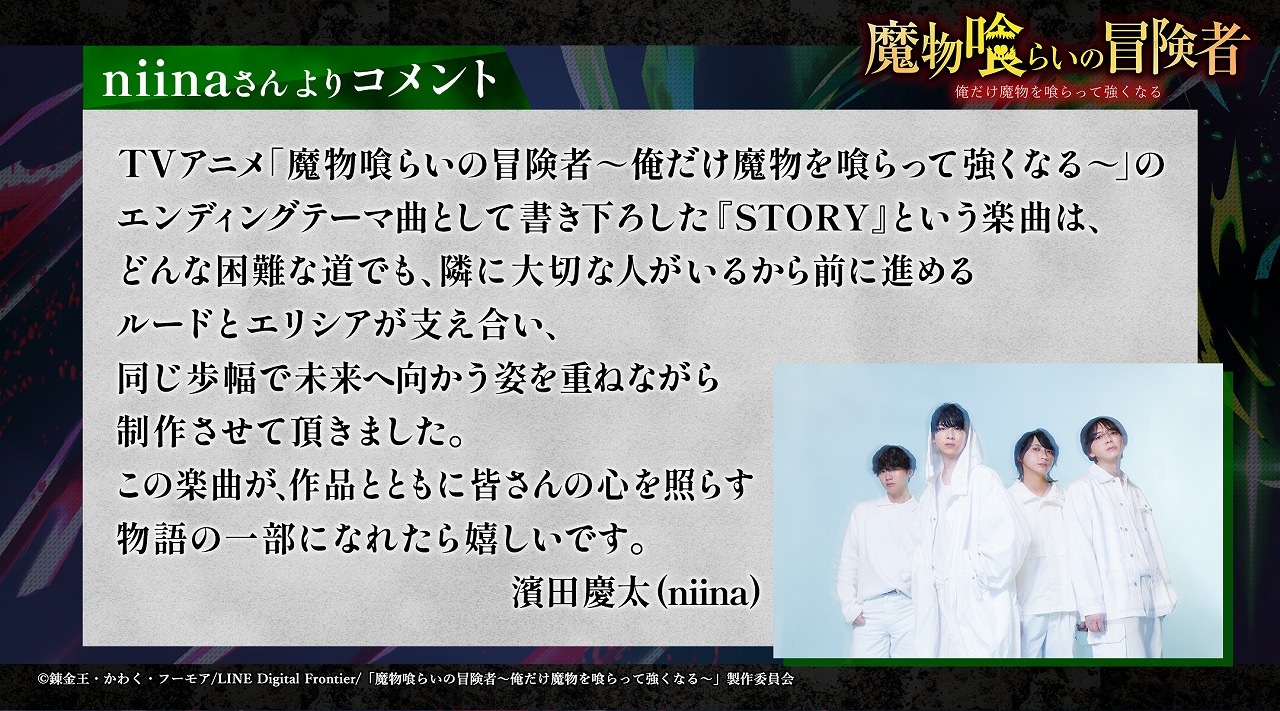 EDは本日バンド体制への体制変更を発表したniinaの新曲『STORY』に決定。戦いを終えたルードとエリシアをそっと支えてくれるような、あたたかな楽曲となっている。また、アーティストコメントも到着した。