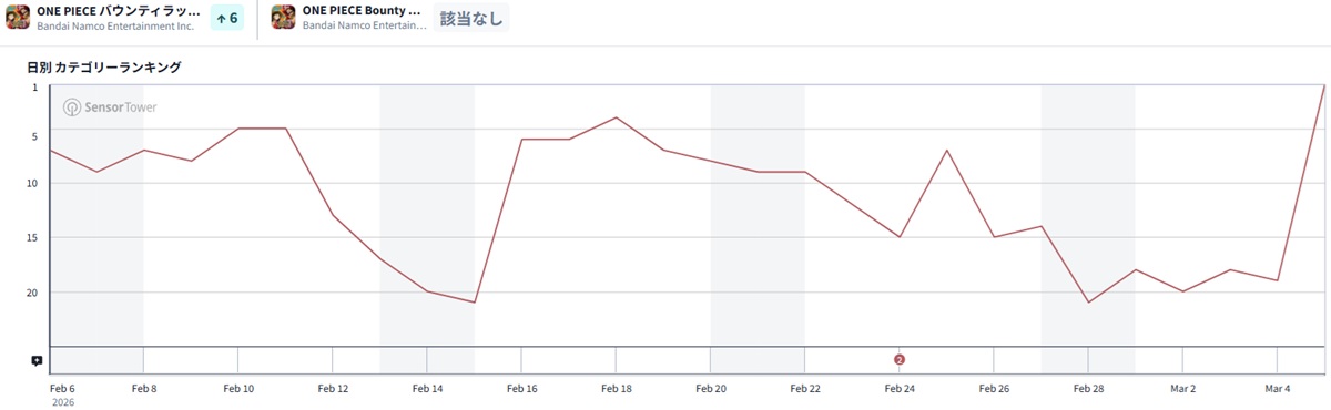 3月6日9時半現在のApp Storeセールスランキング(ゲームカテゴリー)は、バンダイナムコエンターテインメントの『ONE PIECE バウンティラッシュ』が首位に立った。