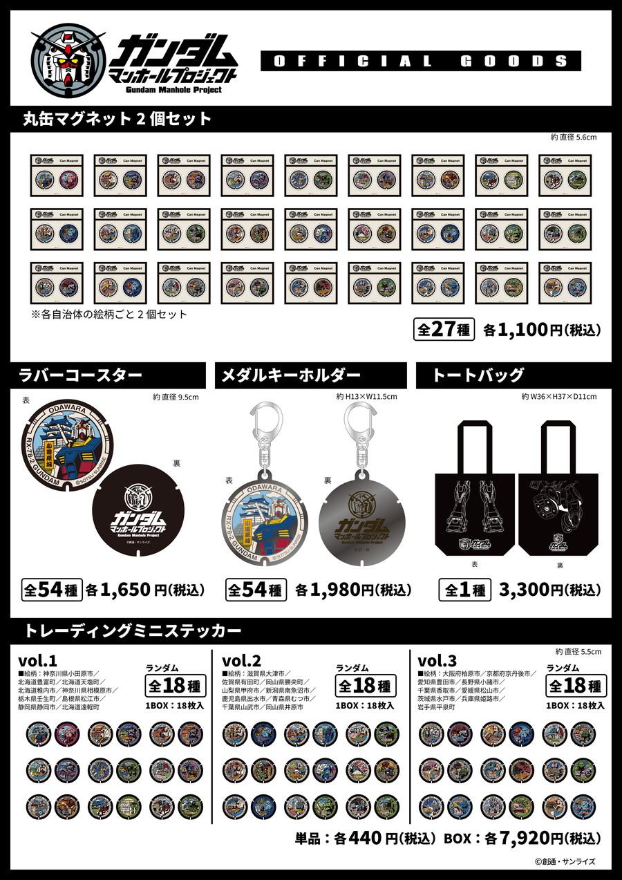 今回発売される公式グッズは、缶マグネット2個セット(全27種)、ラバーコースター(全54種)、メダルキーホルダー(全54種)、トートバッグ(全1種)、トレーディングミニステッカー vol.1~3(各全18種)の計5アイテムである。トレーディングミニステッカーは各マンホール設置自治体の一部店舗でも販売される場合がある。