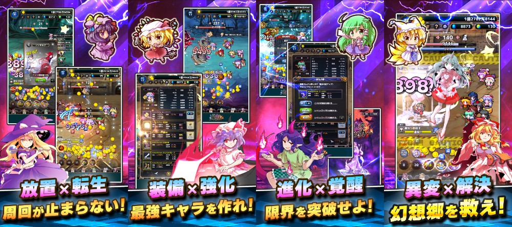 本作は、100万ダウンロード突破『東方幻想クリッカー』の続編となる、放置×転生×弾幕の超インフレ育成なRPG。タップとオートバトルで敵を倒し、転生で永続強化を重ねながら、装備の厳選やカード収集といったやり込み要素を楽しめる。霊夢や魔理沙など120体以上の東方キャラクターが登場するほか、160種以上のボスカード、20曲以上の東方アレンジBGMを収録している。