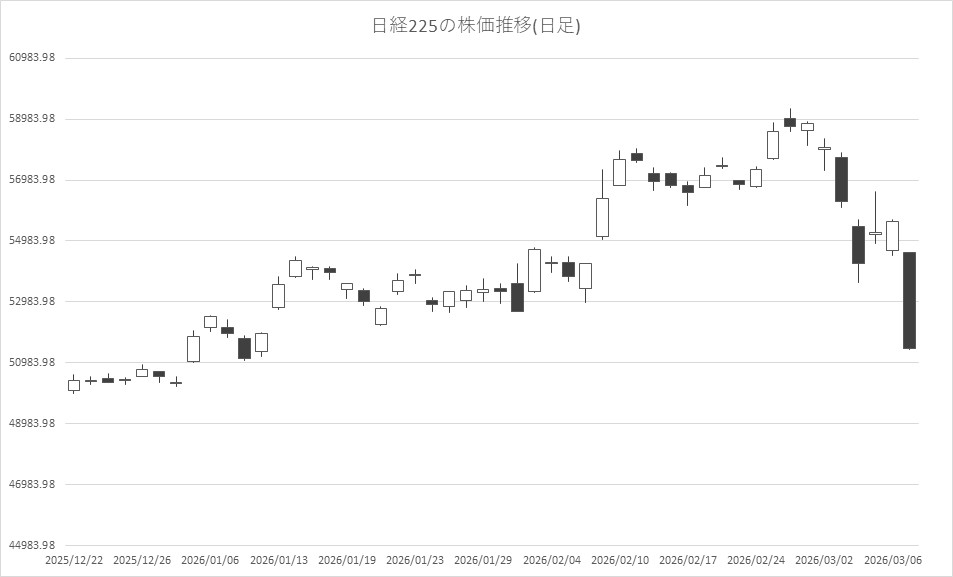 3月9日11時時点の東京株式市場では、日経平均が急落しており、前週末比で4000円を超える下落となっている。中東情勢緊迫化の長期化や米国雇用情勢の悪化を背景にした景気減速への懸念を受けて売りが膨らんでいるという。さらに足元では原油相場が急騰しており、物価高と景気後退が同時に進むスタグフレーションへの警戒も相場心理を圧迫しているという。