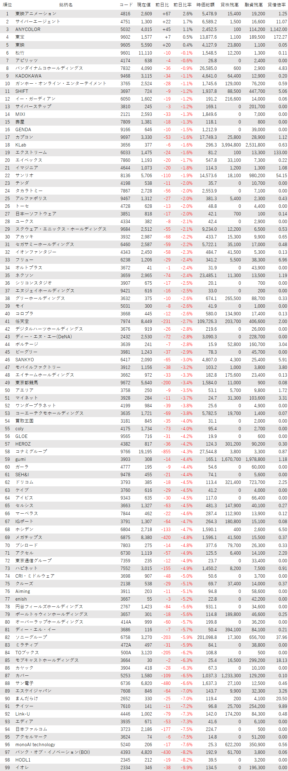 最後に騰落ランキングを見ると、東映アニメ<4816>やサイバーエージェント<4751>、ANYCOLOR<5032>、東宝<9602>、東映<9605>が値上がり率上位となり、イオレ<2334>、HODL1<2345>、バンク・オブ・イノベーション(BOI)<4393>、monoAI technology<5240>、アクセルマーク<3624>が値下がり率上位となった。