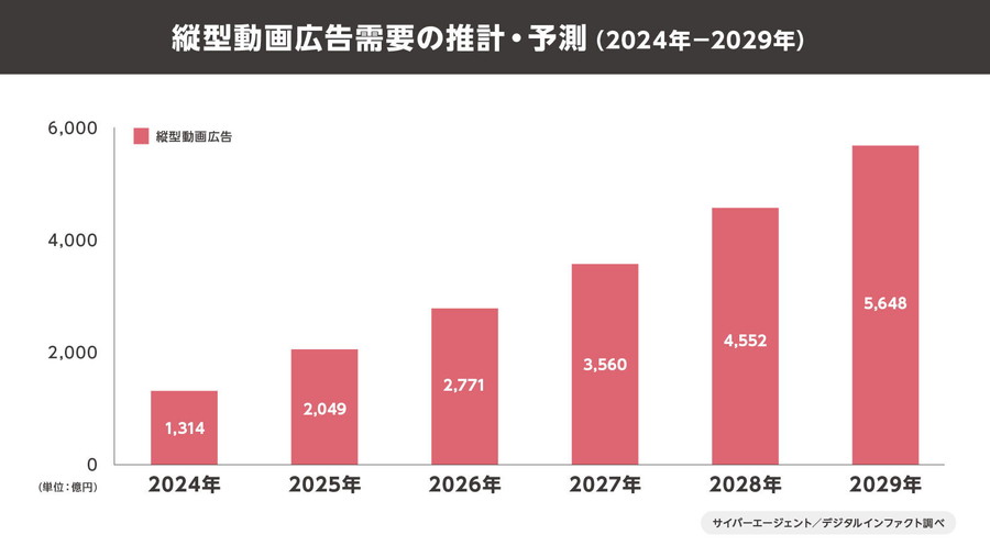 AIを活用した広告クリエイティブ制作、広告配信技術の進歩により、縦型動画広告が広告主の商品・サービスの認知拡大から購買までの幅広い役割を担い続けることで、縦型動画広告の需要は引き続き増加し、2029年の市場規模は5648億円、スマートフォン広告向け動画広告全体の42.5%に達すると予測する。