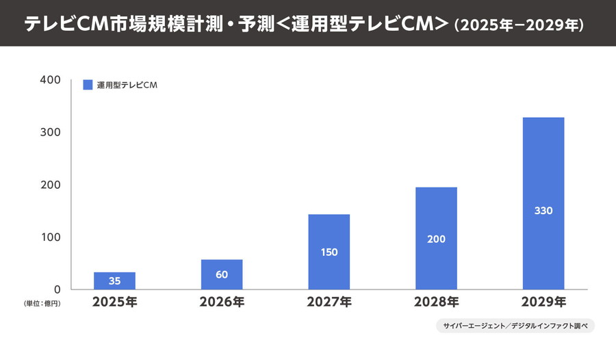 運用型テレビCMの需要は、2025年の35億円から、2029年には330億円に急成長することが期待される。