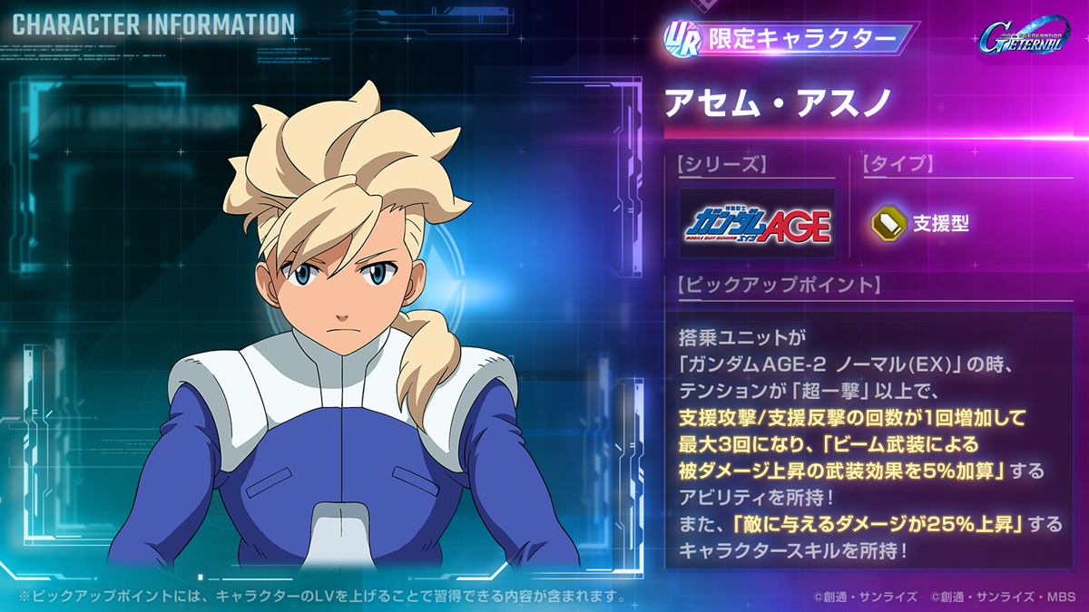 期間限定ユニットとして、UR「ガンダムAGE-2 ノーマル(EX)」 /UR 「アセム・アスノ」がピックアップガシャに登場!また、UR「ガンダムAGE-1 ノーマル(EX)」/UR「フリット・アスノ」や、URサポーター「グルーデック・エイノア&ディーヴァ」も新登場!