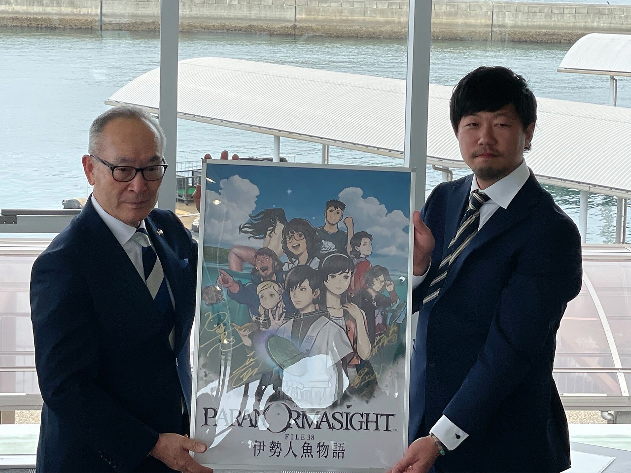 共同記者発表会では、鳥羽市の小竹 篤市長と「パラノマサイト」シリーズの奥州一馬プロデューサーが登壇。タイアップ企画概要紹介や『パラノマサイト FILE38伊勢人魚物語』のサイン入りポスターと、描き下ろし色紙の贈呈が行われた。
