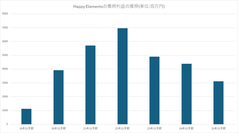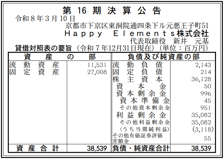 Happy Elementsの2025年12月期(第16期)の決算は、最終利益が前の期比28.8%減の31億1800万円と減益だった。前の期(2024年12月期)の実績は、最終利益43億8400万円だった。3月10日付の『官報』に掲載された「決算公告」で判明した。