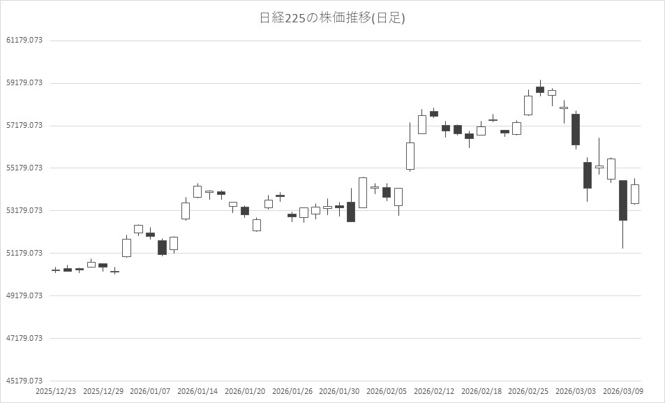 3月10日前場の東京株式市場は反発。日経平均株価は、前営業日比1670円36銭高の5万4399円08銭で午前中の取引を終えた。米トランプ大統領がイランとの紛争はまもなく集結すると述べたことを受けて買い優勢で始まった。前日の大幅安からのショートカバーや自律反発狙いの買いとみられ、買い一巡後はもみ合いで推移した。また、中東情勢への警戒感も依然としてくすぶっているという。