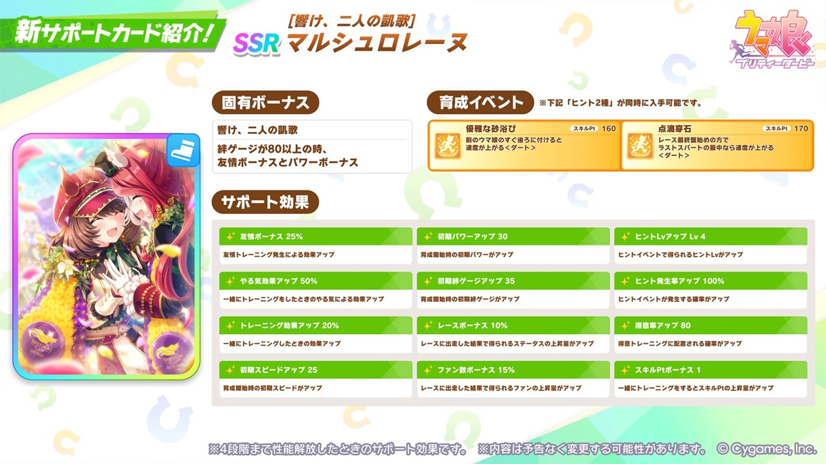 それぞれ新たな育成ウマ娘とサポートカードが登場する。