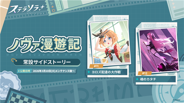 3月10日メンテナンス後より、「ノヴァ漫遊記」に新たな物語「ヨロズ配達の大作戦」「魂のカタチ」を常設追加する。「ヨロズ配達の大作戦」は巡遊者ギルド「ヨロズ配達」のリーダー兼衣装係である「トーナ」に、「魂のカタチ」は大手カンパニー「恩恵意志」の一部門である「黄昏庁(たそがれちょう)」に所属し異端審問官を務める「グレイ」に焦点を当てた物語となる。サイドストーリーとして、ぜひお楽しみください。