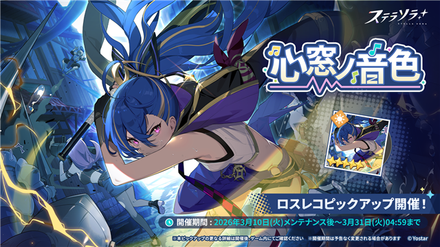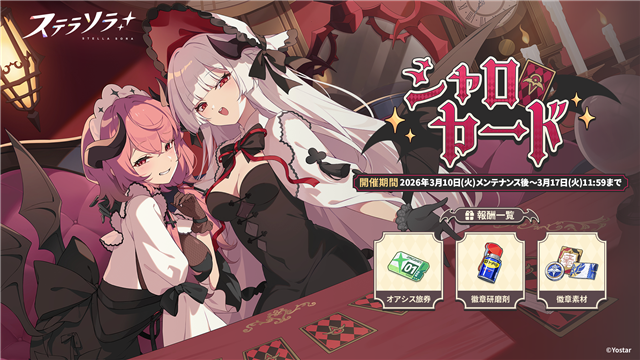 Yostarは、スマートフォン/PC(Windows)向けゲーム『ステラソラ』において、3月10日メンテナンス後より、イベント【セルシア 大討伐作戦】を開催することを発表した。あわせて、★5 巡遊者「ミネルバ」らが対象となるピックアップガチャや、新ミニゲーム【シャロカード】なども実施する。