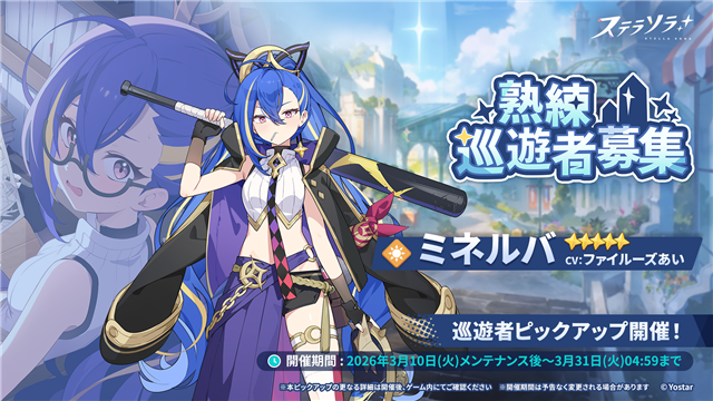 3月10日メンテナンス後より、★5 巡遊者「ミネルバ」などが対象となる巡遊者ピックアップガチャ【熟練巡遊者募集】を開催する。本「巡遊者ピックアップガチャ」では累計120回引くことで、ピックアップ対象の★5 巡遊者を【スペシャル採用】枠にて1名1回まで受け取れる。