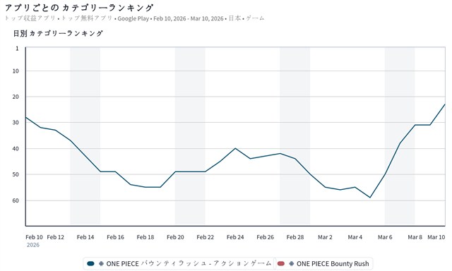 また、バンダイナムコエンターテインメントの『ONE PIECE バウンティラッシュ』が前日の31位から23位まで上昇してきた。『バウンティラッシュ』は、開催中の「2026シャンクス誕生日記念キャンペーン」において、「神避 シャンクス」と「FILM RED シャンクス」が再登場した「超バウンティフェス」を開催していることなどが足元の順位上昇につながっているもようだ。