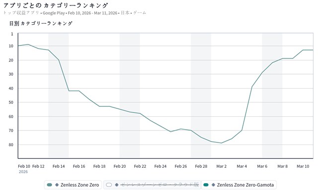 トップ20圏内では、HoYoverseの『ゼンレスゾーンゼロ』が13位とトップ10入りをうかがう位置に付けてきた。『ゼンゼロ』は、3月4日13時より、S級エージェント「アリア(エーテル・異常)」の変調受信確率がUPした独占チャンネル「ネオンエンジェル」を開催していることなどが引き続き売上に寄与しているようだ。