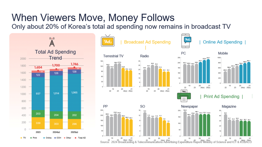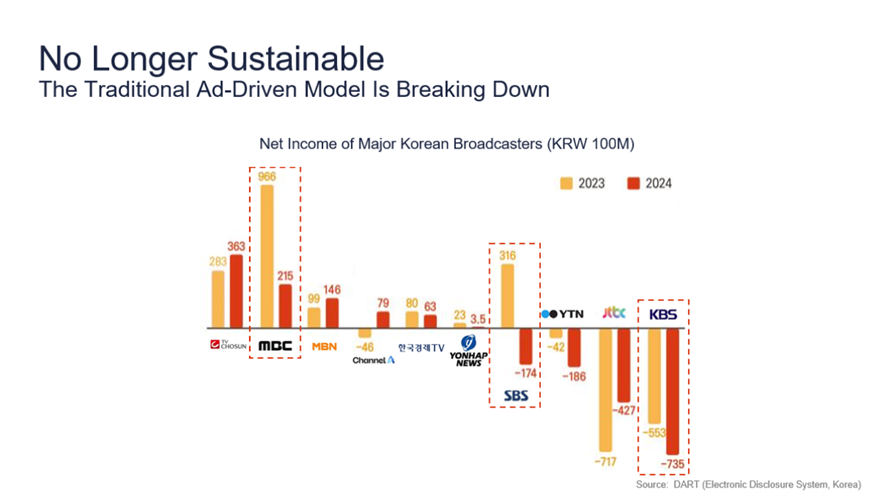 2024年は昨対比でマイナス、KBS・SBSはすでに赤字だが、唯一黒字路線だったMBCも2025年には赤字見込みである。日本が緩やかな下落だとすれば、韓国は急速な下落が起こっている。地上波3大局すべてが赤字なのだ。これはなぜなのか?日本は著作権・肖像権の概念が強く、TV番組はSNSでアクセスすることがほとんどできない。だが、これこそが「抑止力」になっているのだ、という。韓国では地上波の番組のほとんどが、そのままニューメディアであるネット・YouTubeにも配信されている。だから視聴はその分、急速にシフトしてしまう、というわけだ。