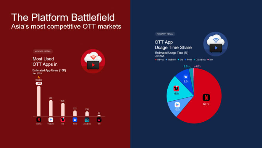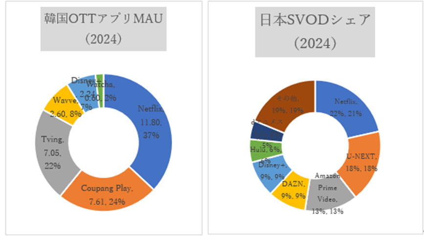 かたや韓国はNetflixがMAUベースで4割、売上や制作投資では市場の約6-7割を握るような状況にあり、それが制作市場にもたらしたものには功罪がある。『イカゲーム』(2021)で世界的な成功をおさめ、Netflixが2023年から発表した「4年間で25億ドルを韓国コンテンツに投資する」という金額規模は、地上波3局の年間コンテンツ予算を合算し規模である。対抗馬としてのTVingやCoupangはスポーツコンテンツを取り込むことで、なんとか攻勢を保っている。