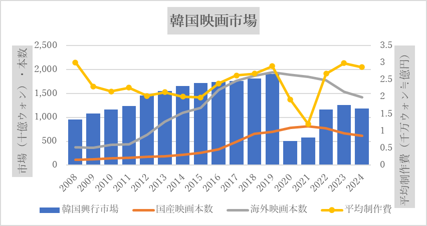 市場が活性化する、という点では外資マネーの誘導は重要だが、その導入スピードがローカル市場と乖離している場合、むしろ健全な制作環境を壊すものにすらなりえる。これはTVだけでなく映画業界も同様だ。なぜ2026年に韓国ローカル映画制作市場が壊れかけているのかといえば、まさにこの5年でのコロナ後の放送VS配信のなかで市場が激変したからだ。制作単価はあがり、本数は絞られ、興行は配信にとられて回復せず、という三重苦のような状態にある。約2000億円まで成長していた2019年がウソのように、コロナ後は6割までしか回復せず、2024~2025は「そこからさらに落ちている」という。韓国からみれば「日本の映画業界を模範として、産業を改革せよ」という現状は、放送の世界で我々が韓国を範としようとしているのと真逆なのだ。