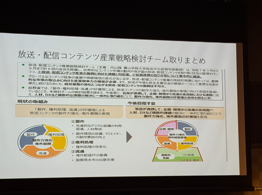 音氏自身も委員として参画する総務省の放送・配信コンテンツ産業戦略チームでは、企画・開発の時点から流通の各課題を認識し、DXによって最初から映像を一体的に製作/権利処理/流通を行うべきだ(かつそれを官民が連携しながら行う)、ということが目指されている。