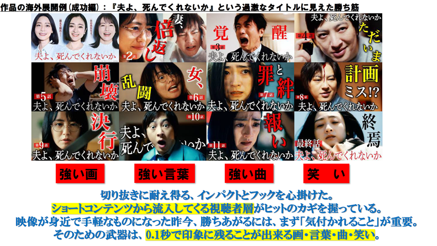 TBS、BABEL LABEL、テレパックなどの製作委員会方式で作られた『夫よ、死んでくれないか』はタイトルからそのインパクトは強烈なものだが、それ以上にTVドラマとしては珍しく「ショートで切り抜きされることを前提とした絵作り」に取り組んだ。「強い画」「強い言葉」「強い曲(ニュージーランドのHAKAをモチーフにした曲を創作)」「笑い」といったフック部分がユーザーに刺さっている。イケメン俳優の怪演で100万回再生された動画もあった。これはテレパック社がこれまでつくってきた『正直不動産』『しょせん他人事ですから』『エビだって鯛を釣りたい』なども同様で、サムネねらいを計算した上でのタイトルづけとなっている。