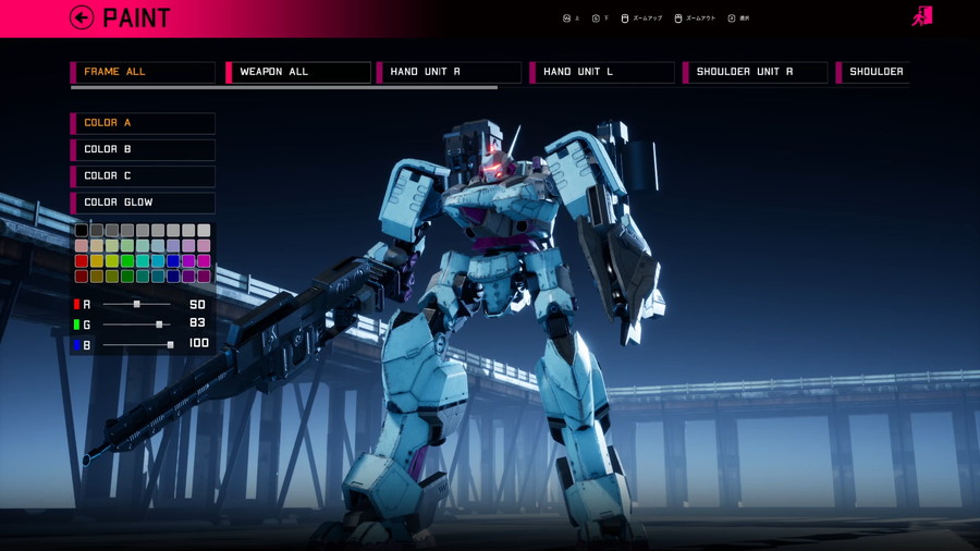 ・頭、胴体、腕、脚などのパーツ組み替えやカラーリング変更、性能チューンアップが可能な充実したカスタマイズ機能を搭載している。
