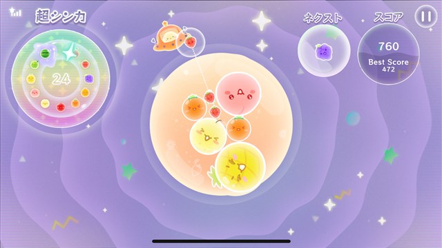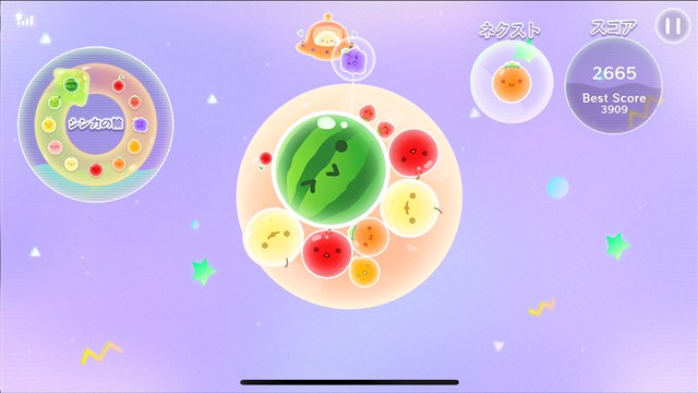 『スイカゲーム ぷらねっと』最大の特徴である円形の惑星ステージは、スマートフォンのタッチ操作と抜群の親和性を見せる。惑星を周回するポッピィーを指先でくるっと移動させ、狙ったポイントにフルーツを落とす。ボタンやスティックでは味わえない、「触れて動かす」という操作の心地よさがゲーム体験をより豊かなものにする。