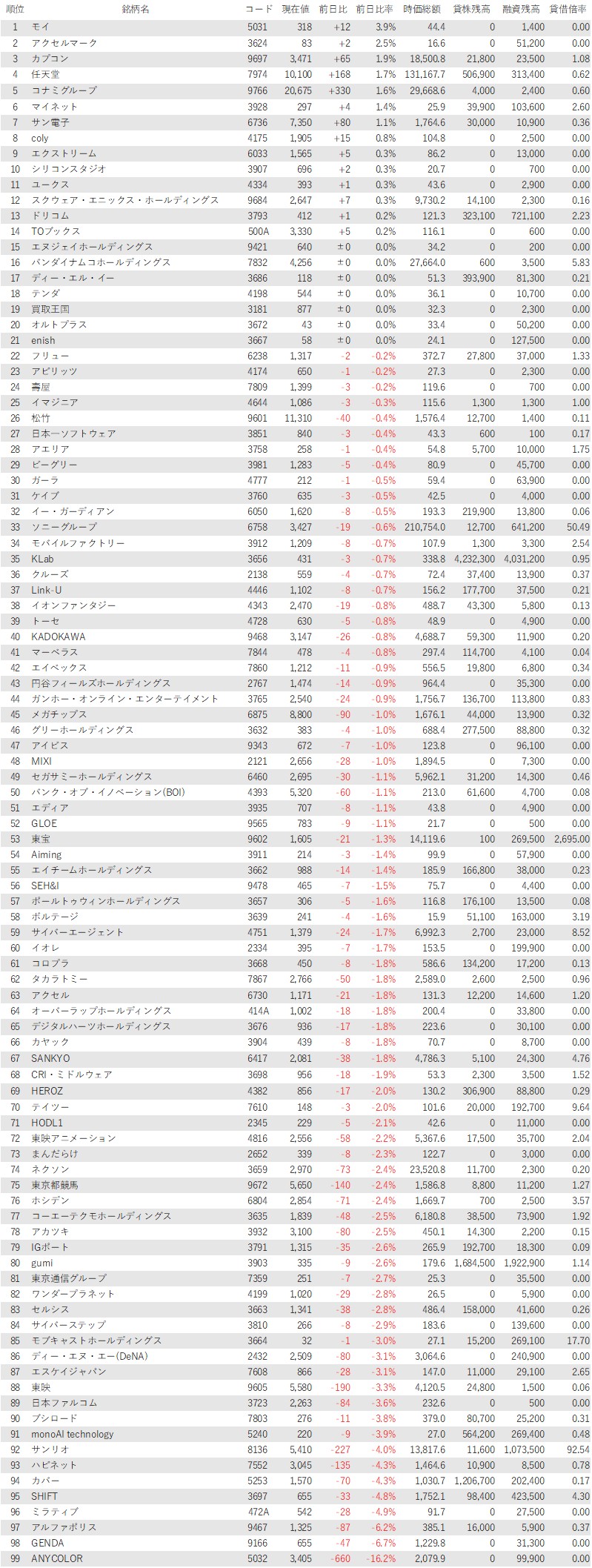 最後に騰落ランキングを見ると、27年1月期も増収増益見通しと発表したモイ<5031>が大幅高となったほか、アクセルマーク<3624>、カプコン<9697>、任天堂<7974>、コナミG<9766>が値上がり率上位となった。業績予想の下方修正を嫌気しANYCOLOR<5032>が急落。GENDA<9166>、アルファポリス<9467>、ミラティブ<472A>、SHIFT<3697>も値下がり率上位に入った。