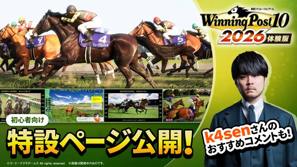 また、初心者向け特設サイトでは、本作の体験版に関する内容やウイニングポストがどのようなゲームなのかを詳細に紹介しているほか、ストリーマーk4senおすすめコメントも掲載。