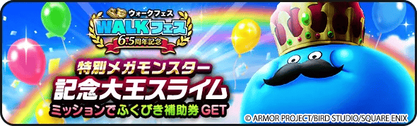 6.5周年のお祝いに、メガモンスター「記念大王スライム」が期間限定で登場!とうばつ回数のミッションで「WALKフェス'26記念 復刻ふくびき前半補助券」を最大100枚手に入れよう!