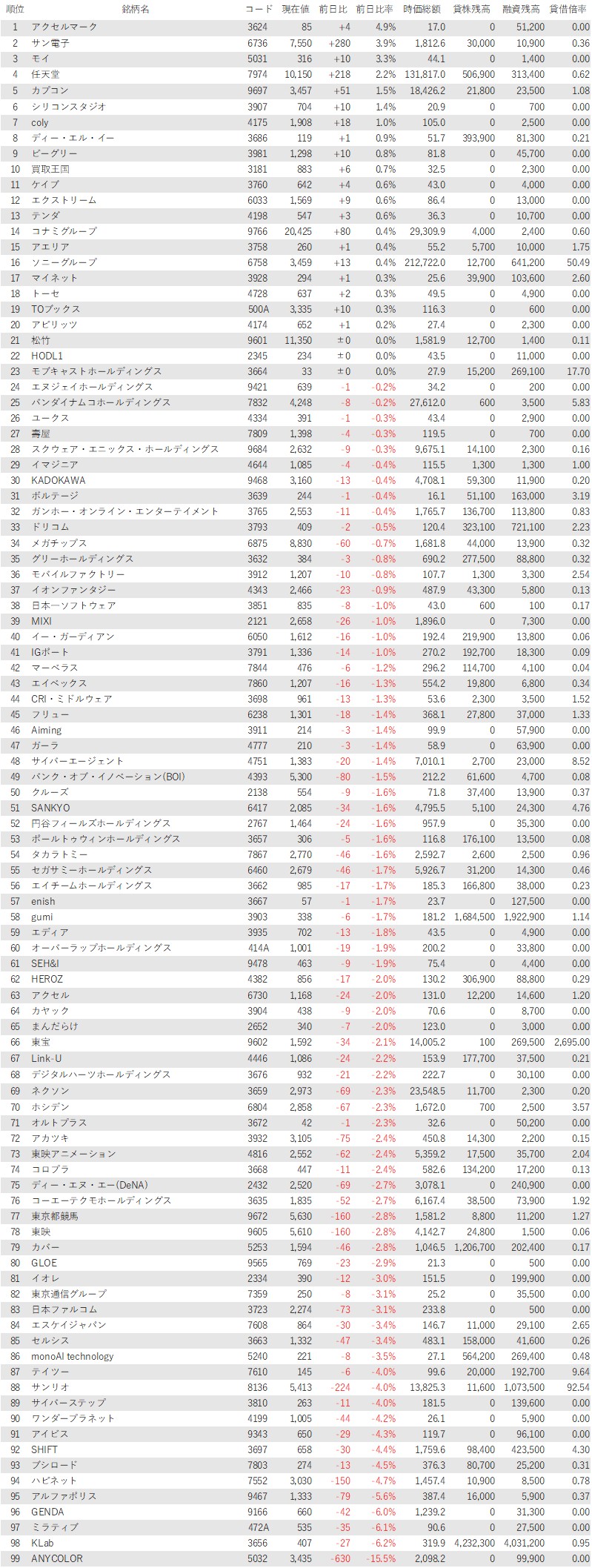 こうしたなか、ゲーム・エンタメ関連企業をみると、登録されている99銘柄のうち、上昇は20銘柄(20%)、下落は76銘柄(77%)、変わらずは3銘柄(3%)で、売り優勢だった。