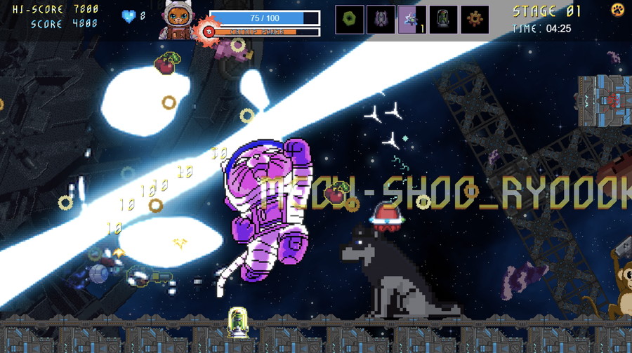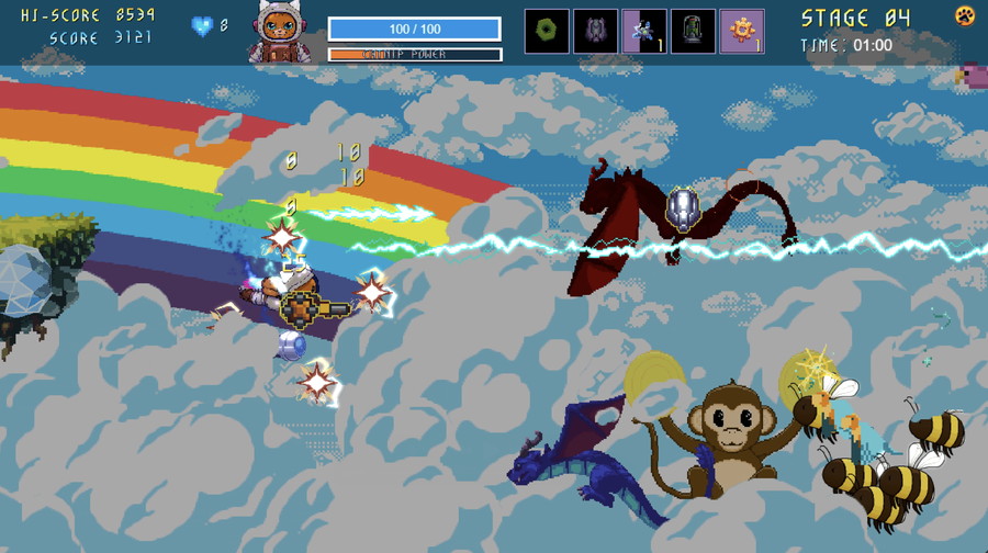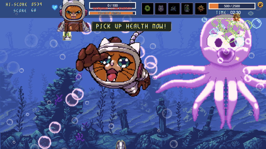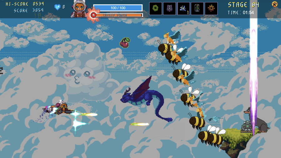 本作は、猫が主人公の、弾幕系シューティング要素を持つハイスピードなキュートエムアップだ。カラフルな弾幕地獄と、エイリアン技術を操る愛らしい動物たちで満たされた、テンポの速いサイドスクロールアクションが展開される。