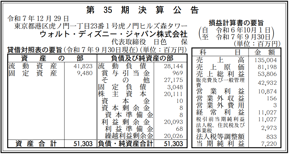 ウォルト・ディズニー・ジャパンの2025年9月期(第35期)の決算は、売上高1350億0400万円(前の期比9.6%増)、営業利益108億7400万円(同45.8%増)、経常利益110億2700万円(同44.9%増)、最終利益72億2000万円(同52.0%増)だった。3月13日付の『官報』に掲載された「決算公告」で判明した。