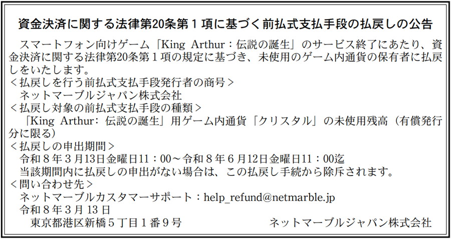 ネットマーブルは、北米を拠点とする子会社Kabamが運営していた『King Arthur: 伝説の誕生』について3月12日にサービスを終了した。同タイトルは、2024年11月27日よりサービス提供が行われていた。