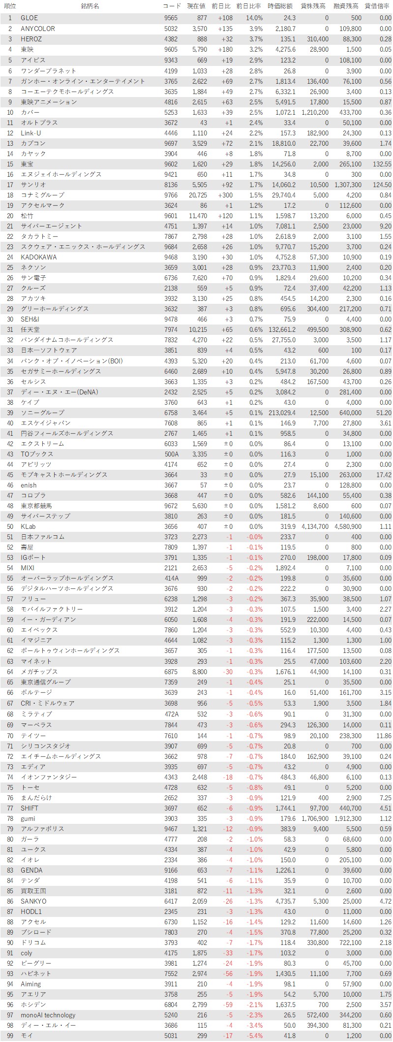 こうしたなか、ゲーム・エンタメ関連企業をみると、登録されている99銘柄のうち、上昇は41銘柄(41%)、下落は49銘柄(49%)、変わらずは9銘柄(9%)だった。売り優勢だが、相対的に堅調に見える。もう少し様子を見たいところだが、一時のような半導体やAI関連に資金の集中する流れに変化が出てきたのだろうか。