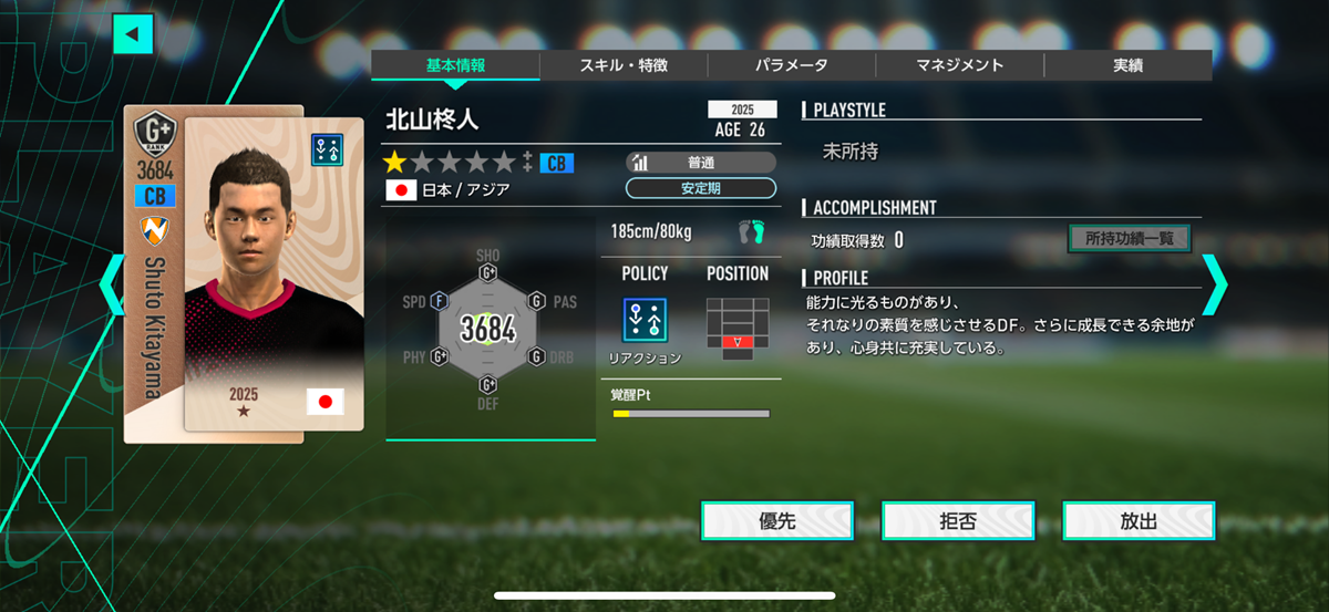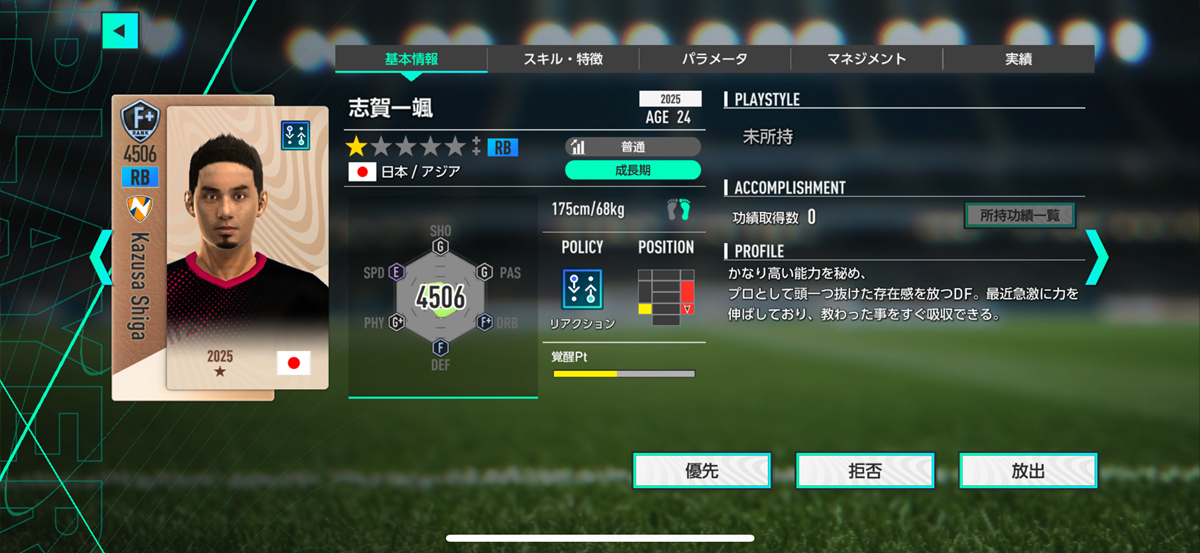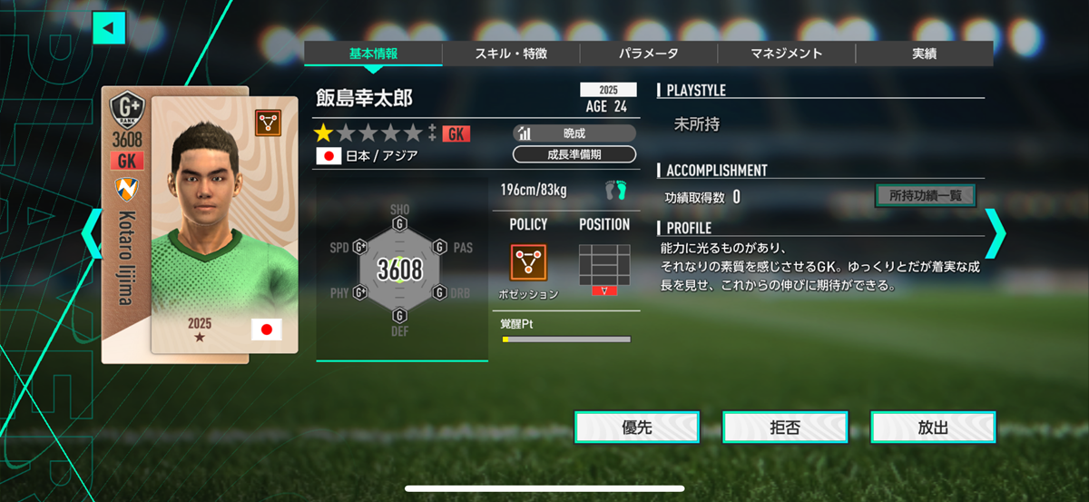 ▲1シーズン目はセカンドキーパーだったが、プランBの特徴のひとつ“5枚替え(GKも交代する場合がある)”の恩恵を受けて2シーズン目は多少出場機会が増えた。GKとしては小柄だが大胆な飛び出しが持ち味だ。尊敬する選手はメキシコの伝説的GK“ホルヘ・カンポス”。