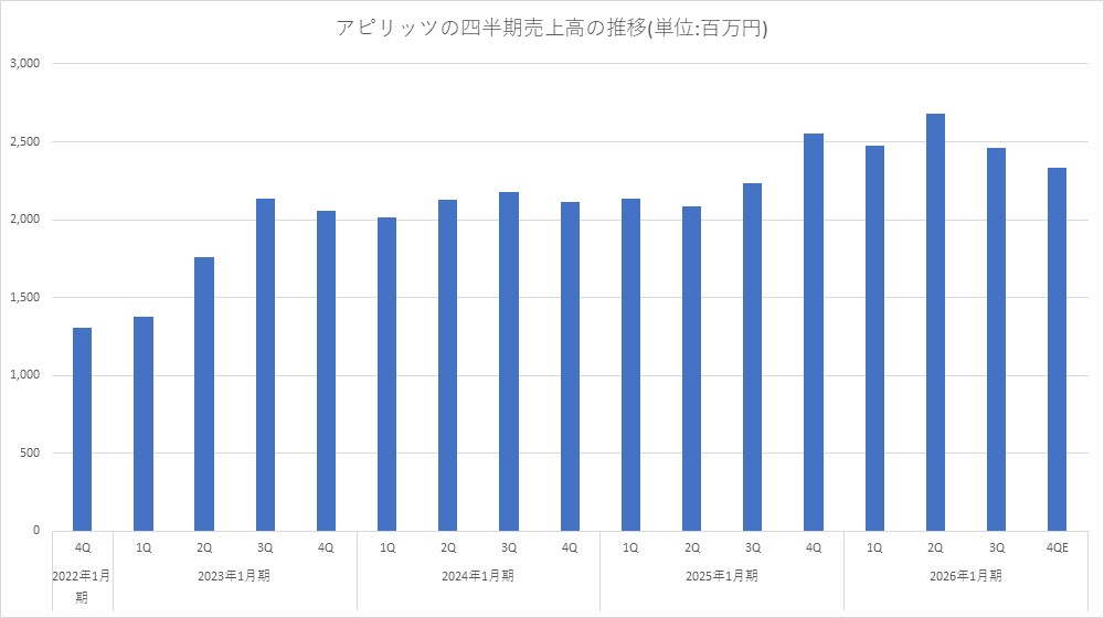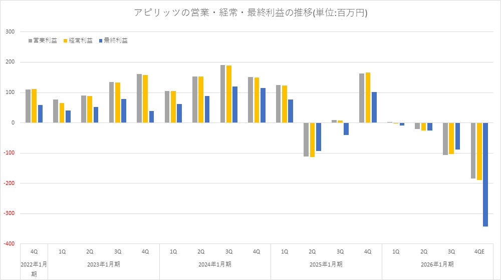 アピリッツ<4174>は、3月13日、2026年1月期の連結業績予想の下方修正を行い、売上高99億5500万円(前回予想105億5100万円)、営業損失3億0900万円(同1億0300万円の利益~1億7200万円の利益)、経常損失3億1700万円(同9000万円の利益~1億6000万円の利益)、最終損失4億6500万円(同5100万円の利益~9700万円の利益)とした。