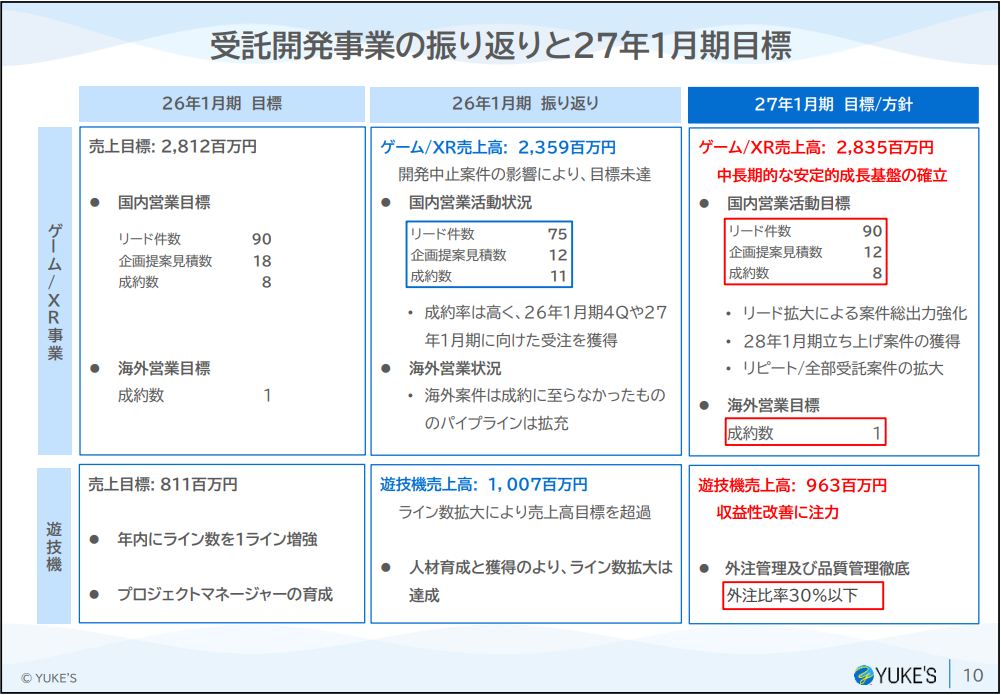ユークス<4334>は、この日(3月13日)、2026年1月期においてゲーム開発の受託成約数については目標とする8件を上回る11件だったと明らかにした。事業開発本部を中心とした営業活動の強化を行い、受注状況は回復した、としている。2027年1月期以降の稼働は概ね確保されているとのことで、業績にも寄与してくる見通しだ。